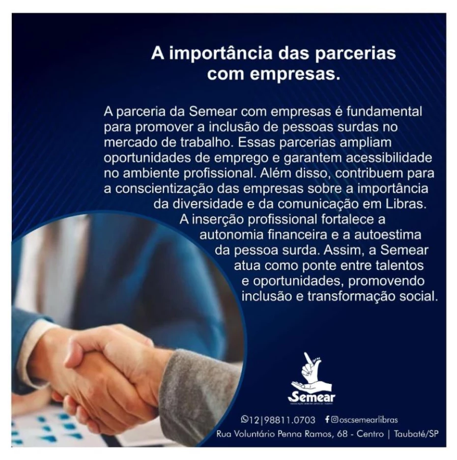 A Semear também estabelece parcerias com empresas e instituições, visando inserir pessoas surdas no mercado de trabalho, promovendo a autonomia e o fortalecimento da comunidade surda.